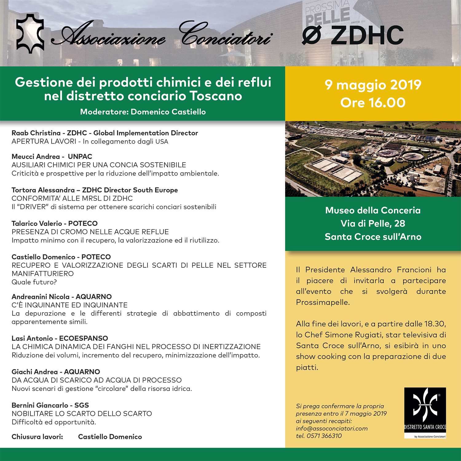 Andamento e prospettive del comparto chimico-conciario, sullo sfondo dei risultati raggiunti nel distretto toscano sotto il profilo della evoluzione eco-compatibile: se ne parlerà nel corso dell’evento “Gestione dei prodotti chimici e dei reflui nel distretto conciario toscano”, giovedì 9 maggio presso il Museo della Conceria a Santa Croce sull’Arno dalle ore 16. L’evento, promosso dall’Associazione Conciatori con la partecipazione di ZDHC, prevede una tavola rotonda in cui tecnici e ricercatori di impianti industriali del territorio si confronteranno con rappresentanti dell’industria chimico-conciaria. Tra i relatori: Andrea Meucci (UNPAC), Alessandra Tortora(ZDHC), Domenico Castiello e Valerio Talarico(POTECO), Nicola Andreanini e Andrea Giachi( Aquarno), Antonio Lasi(Ecoespanso), Giancarlo Bernini(SGS).